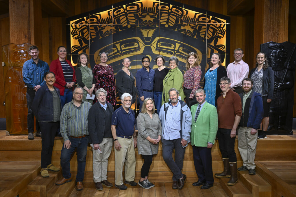 Caption: Grant recipients at the Shuká Hít (Clan House) at Sealaska Heritage Institute’s Walter Soboleff Building.